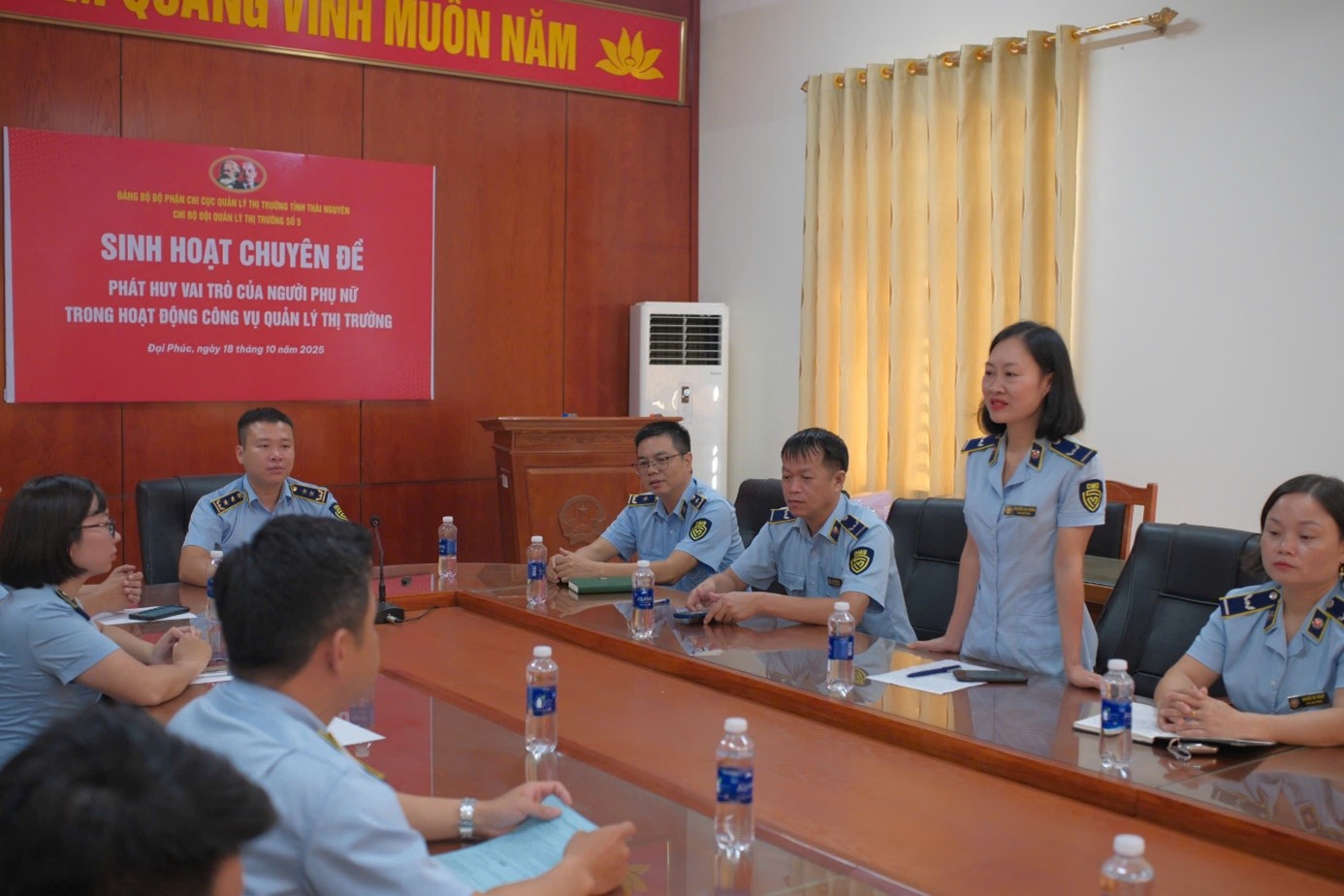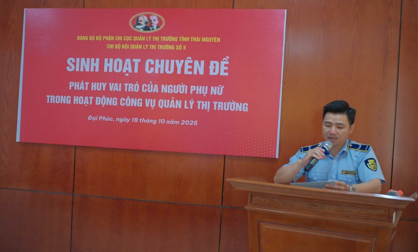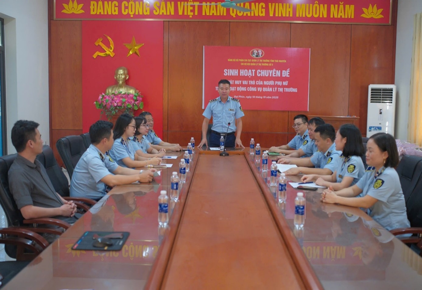 Ngày 18/10/2025, Chi bộ Đội Quản lý thị trường số 5 tổ chức sinh hoạt chuyên đề với chủ đề “Phát huy vai trò của người phụ nữ đảng viên trong hoạt động công vụ Quản lý thị trường”. Dự và chủ trì buổi sinh hoạt có đồng chí Phạm Duy Bình, Bí thư chi bộ, Đội trưởng Đội Quản lý thị trường số 5 cùng các đồng chí đảng viên trong Chi bộ và người lao động của đơn vị.