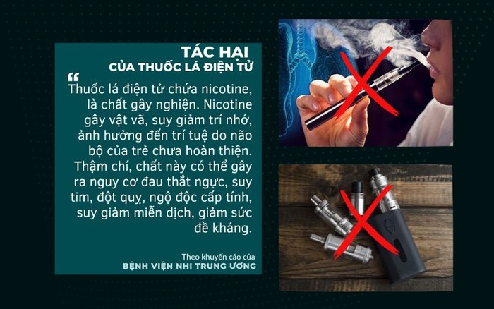 Về thuốc lá điện tử: Các đối tượng chế biến, sản xuất những loại ma túy mới, chưa có trong danh mục cấm pha, trộn trong dung dịch thuốc lá điện tử; Các chất ma túy mới bao gồm: 1eP-LDS, 2-FMA, 3-FEA, 3-MMC, MDMB-4en-PINACA, ADB-BUTINACA, 4F-MDMB-BUTICA, 4F-ABUTINACA; tác hại của loại ma túy này sẽ gây ra ảo giác, có thể xuất hiện co giật, hôn mê, thậm chí tử vong đối với người sử dụng. Trong thuốc lá điện tử còn chứa các chất hoá học phụ gia như methyl salicylate, glycerin, hay propylence glycol. Đây là các hóa chất có thể gây ung thư hoặc tổn thương phổi.